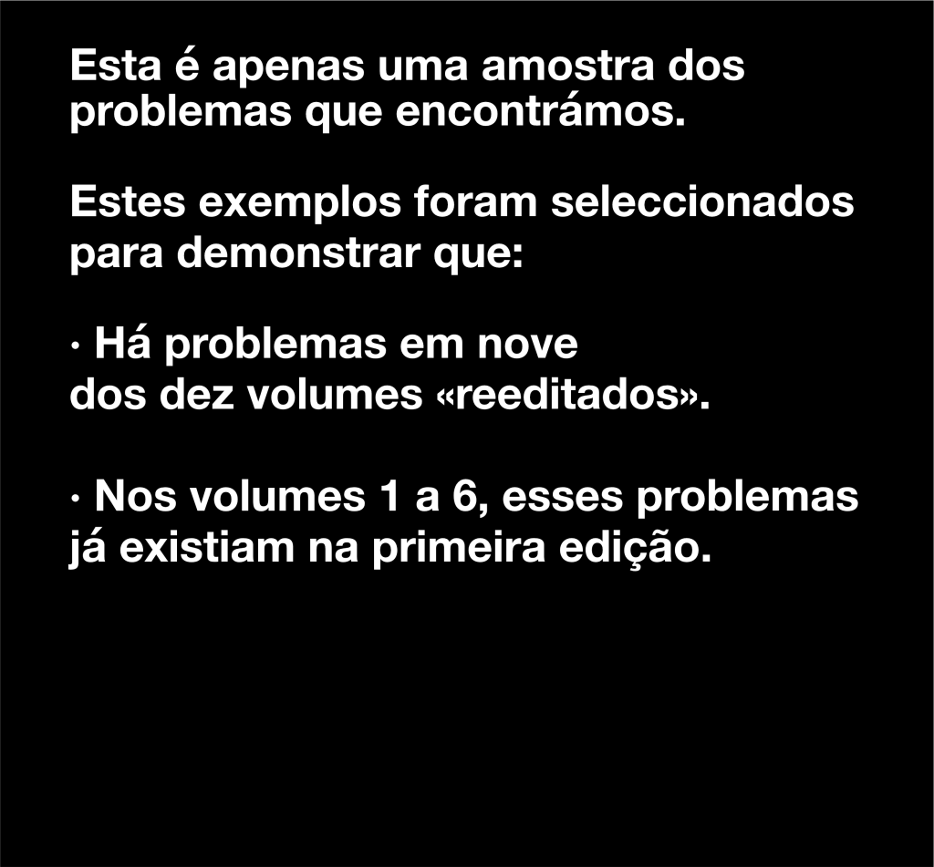 Examinámos todos os livros e concluímos que os seis volumes revistos (1 a 6) contêm problemas graves que já estavam nas primeiras versões. Dos restantes volumes, três (7,8,9) têm problemas inequívocos. Nove dos dez volumes têm problemas.