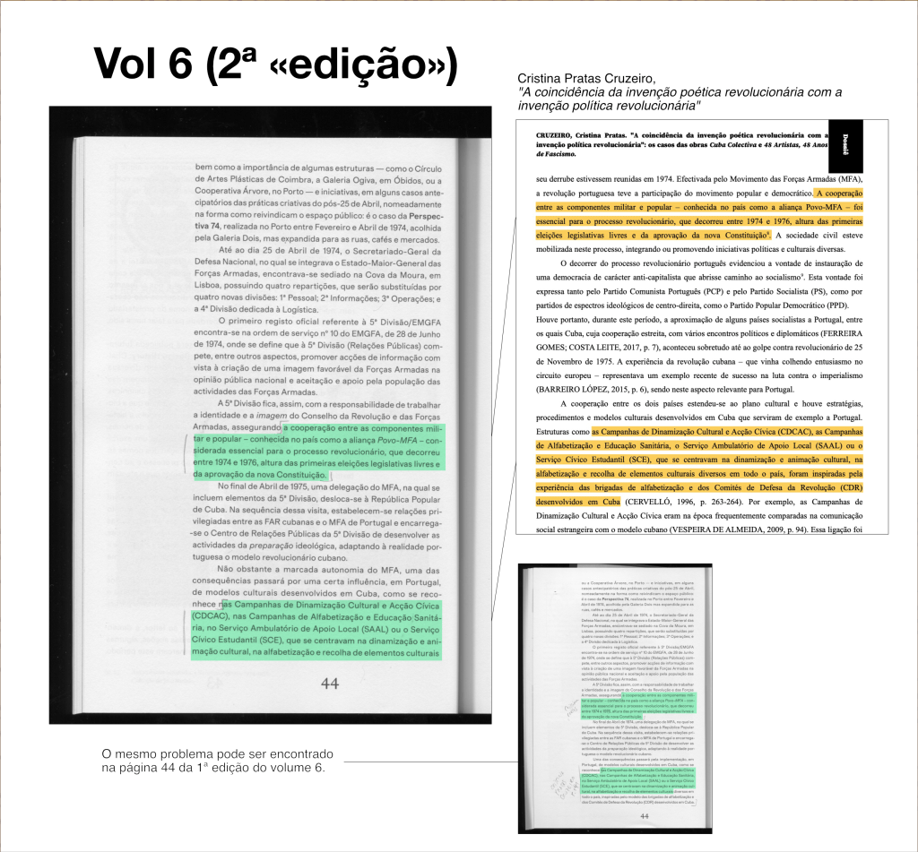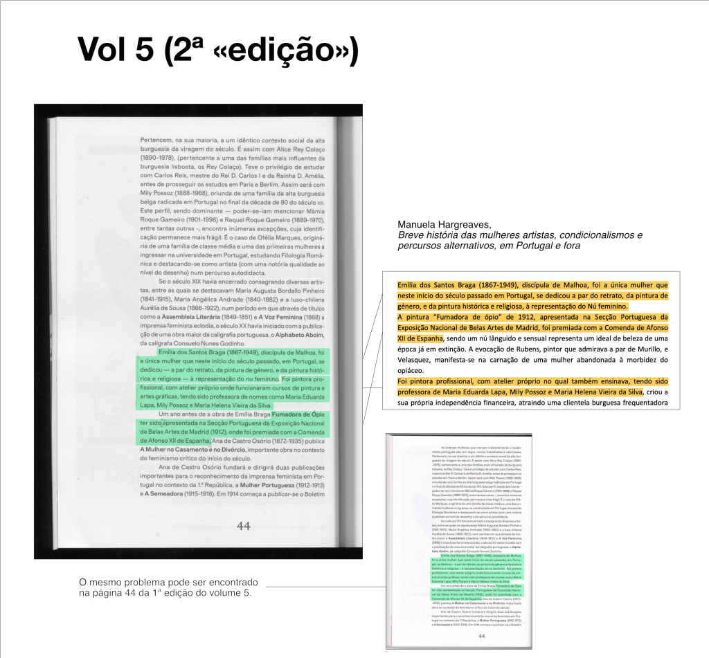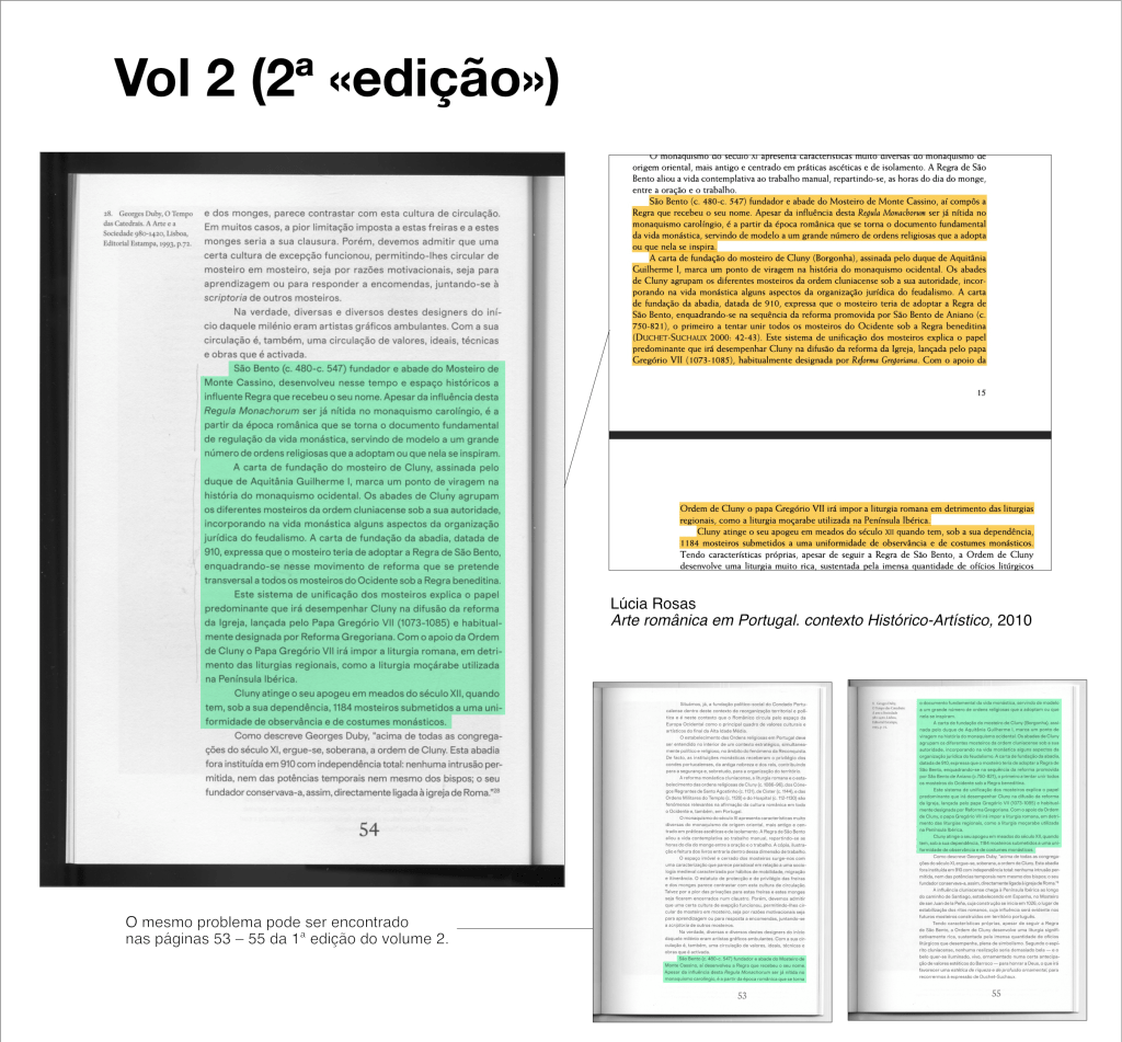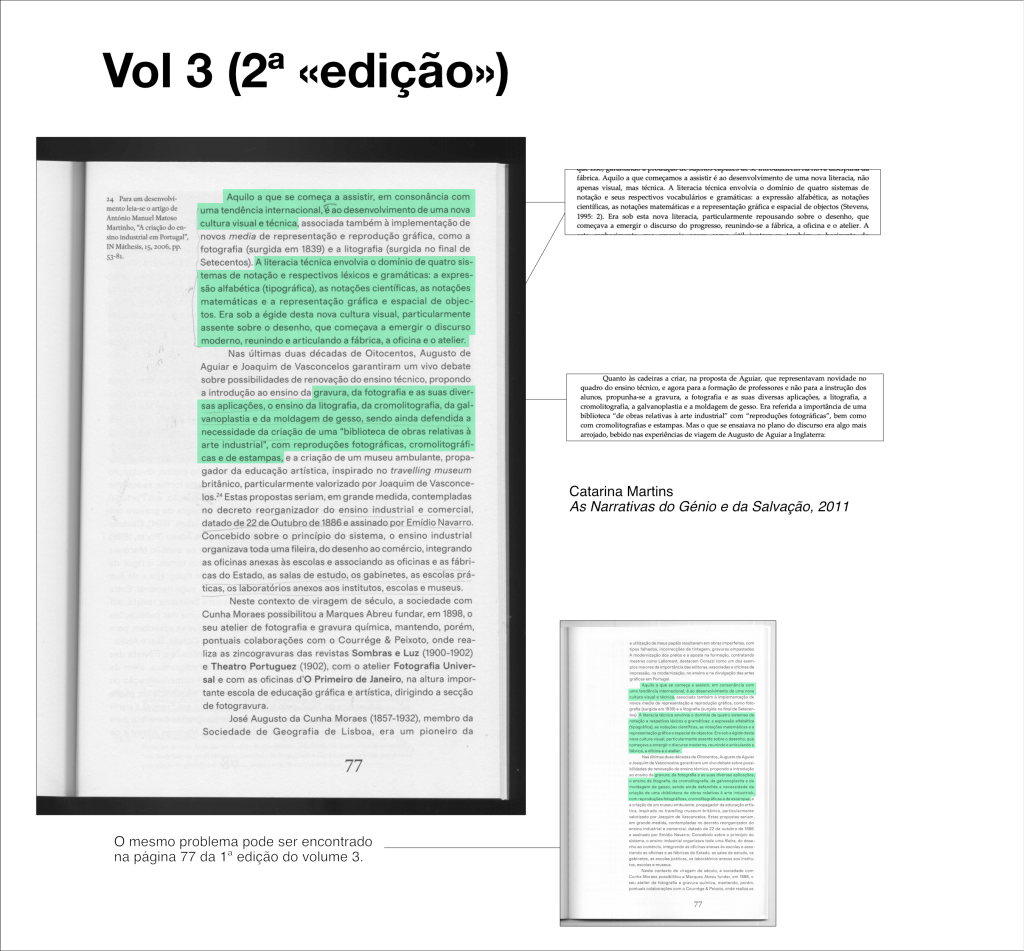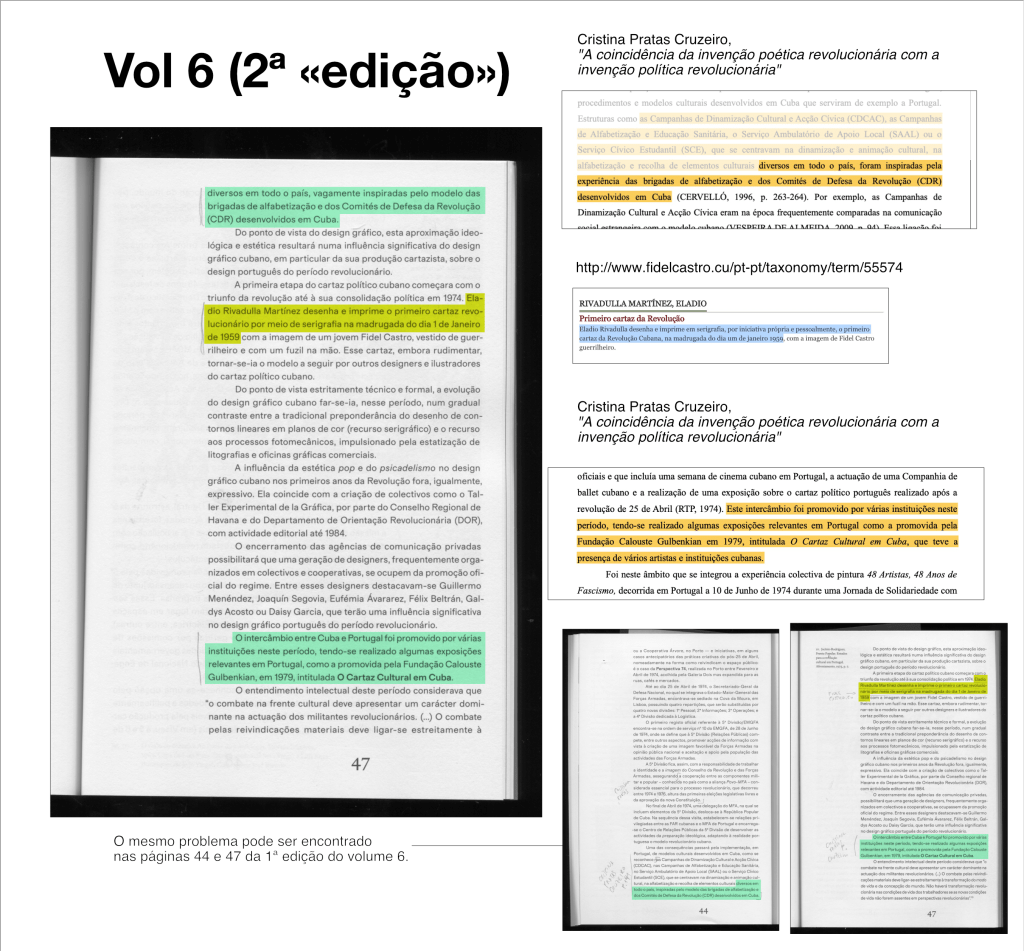 As imagens que postamos aqui não ilustram os problemas mais graves ou mais extensos que encontrámos. Não devem ser tomadas como um inventário completo. Servem apenas para mostrar que em nove dos dez volumes editados ocorrem situações de cópia literal ou parcial não referenciada. Apresentamos exemplos de cópia não referenciada (sem referência ao autor original ou sem sinalizar que se trata de uma transcrição).