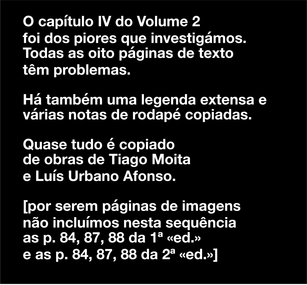 O Capítulo IV do Volume 2 é um dos piores capítulos da História do Design Gráfico em Portugal. Muitos dos seus problemas transitaram para a segunda «edição». Na primeira, todas as oito páginas de texto tinham problemas. Na segunda, o capítulo passou de oito para onze páginas de texto. Oito têm problemas.